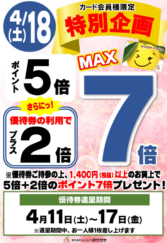 エミカ会員様限定企画として、プラス2倍優待券を配布します。期間中の来店1回目にお1人様1枚限りでプラス2倍優待券を発行。3/7(土)に1,400円(税抜)以上のお買上の方で優待券を利用していただくと、ポイント7倍!